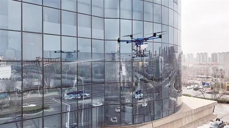 近日,正在赛罕区金桥“双创”示范区的一栋写字楼玻璃幕墙外,一款名叫“北洁卫士”的无人机正正在高空功课。通过地面操控,它能够完成100米的高空清洗,通过喷出环保洁净液降解污渍,一天可洁净8000平方米,相当于40层楼的外墙面积。
