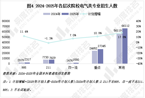 本年除了211高校以外各条理招生人数均有增加。其他院校扩招幅度最大,这为更多考生供给了攻读电气专业的机遇,985院校增幅达到11。4%,扩招比例不低,但绝对数量添加不多,头部院校培育沉点不是规模扩张,而聚焦于国度计谋需求的尖端范畴,如智能电网、能源互联网、新型储能等。