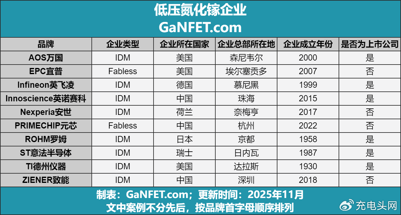 为探究低压氮化镓企业分布环境,计了市道上公开的低压氮化镓企业数据进行了汇总阐发,可见当下已有十余家出名功率器件厂商深度结构这一范畴。