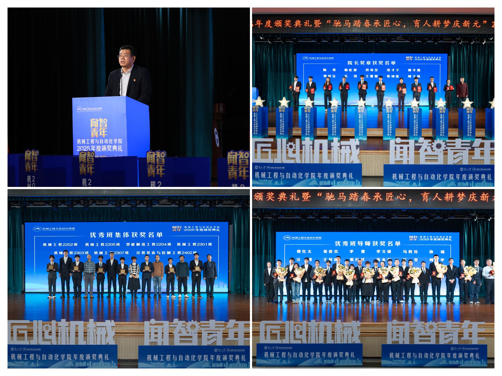 学院党委郝建山正在致辞中系统回首了一年来学院取得的主要成绩。学院积极办事国度计谋,投身深度金属矿智能开采纳配备全国沉点尝试室扶植,并正在环节科研范畴实现标记性冲破,获得国度严沉专项支撑。同时,学院成功引进增材取激光制制范畴领军团队,稳步推进学校新增学位点扶植,为久远成长奠基根本。正在人才培育方面,学院学子表示凸起,研究生学术丰盛,正在“挑和杯”“中国国际大学生立异大赛”等多项赛事中斩获国度级项,结业生就业率持续连结高位,展示了全面成长的优良素养。郝建山阐释了“闻智青年”品牌的育人内涵,勉励全体师生胸怀“国之大者”,将小我成长融入“制制强国”计谋,过硬本事,怯于立异创制,勤奋成为担任平易近族回复大任的时代新人。副院长罗忠表扬决定。颁环节分三轮顺次进行。起首颁布的是“院长章”,刘云飞为毛羽等10名正在专业进修、科技立异、社会实践等方面表示杰出的学生颁布章。随后颁布“优良班集体”项,班导师代表为7个正在班风、学风及凝结力扶植中成效显著的班级颁。最初,仪式聚焦育人一线论理学生代表向获评“优良班导师”的教员们献上鲜花取荣誉证书,表达诚挚感谢感动。“院长章”获得者代表毛羽连系科研竞赛取意愿办事履历,讲述了“道阻且长,行则将至”的成长;“优良班集体”获代表豆煜轩分享了班级凝心聚力、共建优秀学风的活泼经验。正在“闻智匠心 共话青蓝”出格环节,优良班导师马哲伦取所带班级学生代表刘定佳同台交换,从分歧视角展示了师生间思惟引领、学业互帮、讲授相长的温情互动,彰显了育人一线的深挚交谊取结实成效。据悉,“闻智青年”是机械工程取从动化学院出力打制的文化育人品牌。也是典型树立、激励朝上进步的主要平台,旨正在指导全体学生以先辈为楷模,坚想、夯实专业根本、锻制立异能力,勤奋成长为具有家国情怀、全球视野取创制活力的杰出工程人才,为学校“双一流”扶植和高质量成长注入芳华力量。