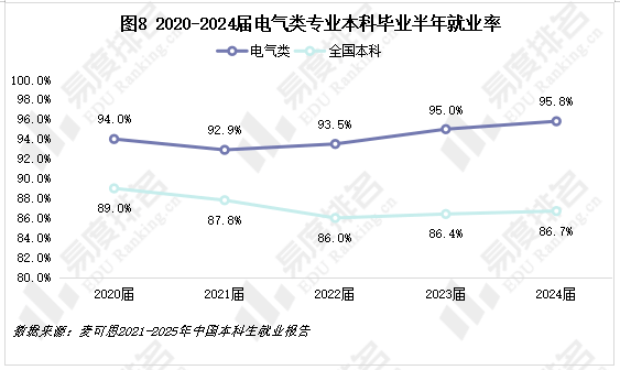 电气类专业不只是抢手,更是一个能经济波动、供给极高就业确定性的压舱石型专业。其就业率不只常年大幅领先全国本科平均程度,而且领先劣势还正在持续扩大。近两届就业率持续冲破95%,电气专业的就业市场正处于景气周期的高点,社会需要电气人才,并且越来越需要。强大的就业韧性和奇特的市场所作力让其就业率正在所有专业类中排名第二。